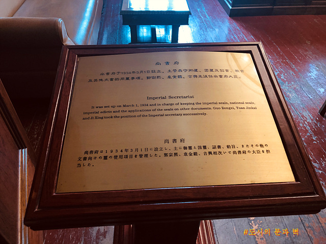푸이가 살았던 이 궁전은 그 자체로 한 시대의 역사를 증언하는 공간이었다. 입구부터 만주국 시절의 건물과 가구가 원형 그대로 보존되어 있어, 마치 그 시대에 발을 들여놓은 듯한 느낌이 들었다. 궁전 내부를 돌아다니다 보면 일만의정서가 조인된 장소도 그대로 남아 있어, 만주국의 설립이 어떻게 관동군에 의해 이루어졌는지를 생생하게 느낄 수 있다. 당시의 책상과 의자, 그리고 의정서가 조인된 회의실의 모습은 당시 일본 제국의 영향력과 푸이의 허울뿐인 황제라는 위치를 상기시켜 준다.